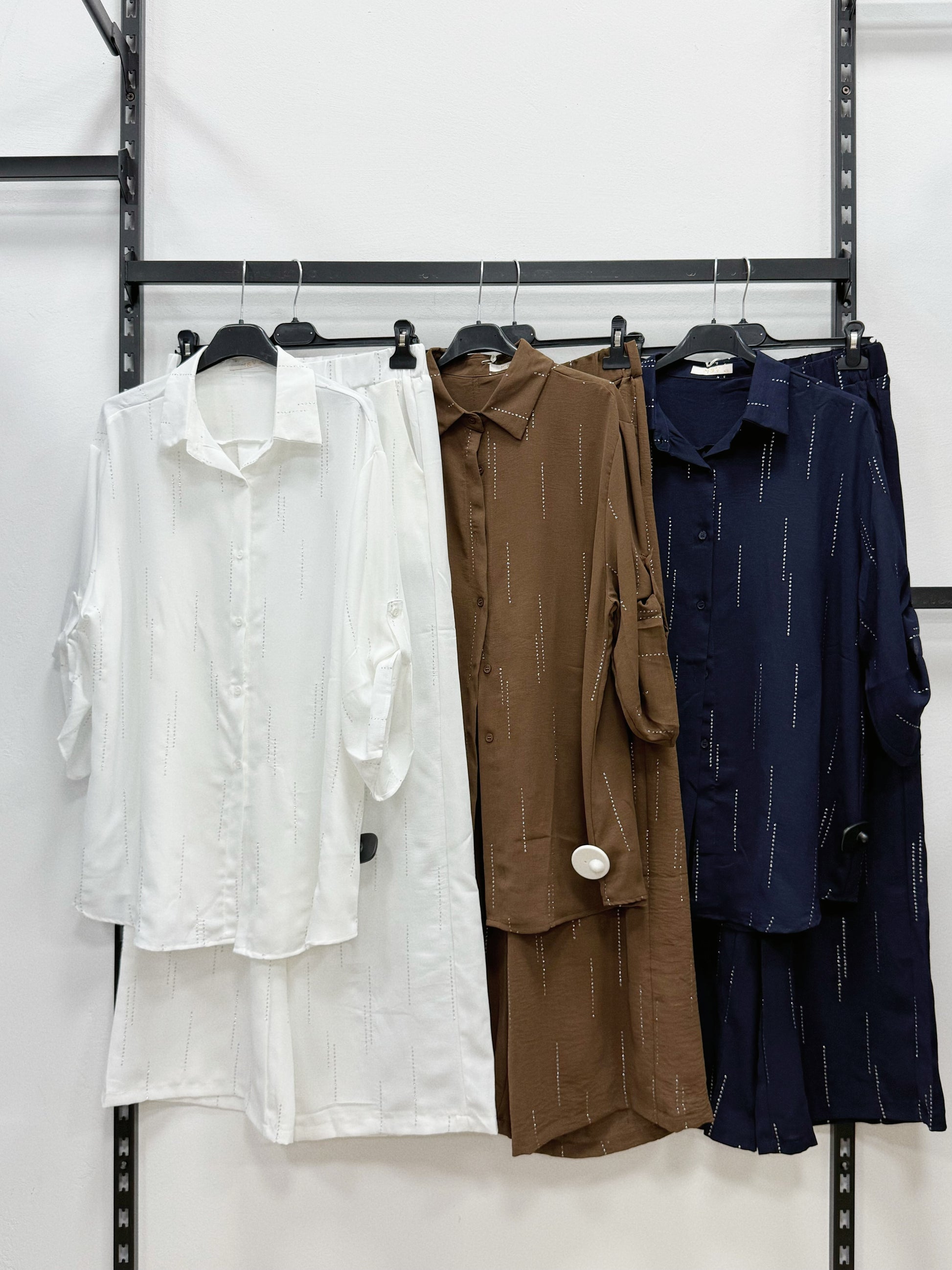 TUTA COMPLETA CAMICIA A MANICHE 3/4 E PANTALONE A GAMBE LARGHE CON STRISCE DI LUREX